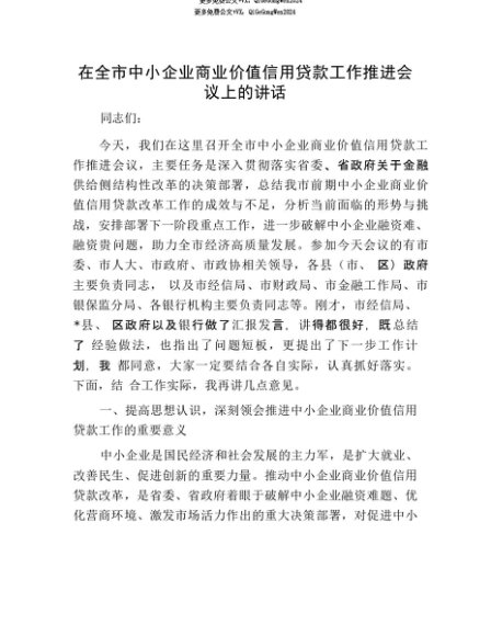 【七哥公文】2025年:【七哥公文】在全市中小企业商业价值信用贷款工作推进会议上的讲话+更多免费公文+VX:QiGeGongWen2024+更多免费公文+VX:QiGeGongWen2024