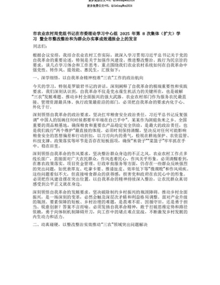 【七哥公文】2025年:【七哥公文】市农业农村局X组书记在市委理论学习中心组2025年第8次集体(扩大)学习暨全市整改整治和为群众办实事成效通报会上的发言+更多免费公文+VX:QiGeGongWen2024+更多免费公文+VX:QiGeGongWen2024