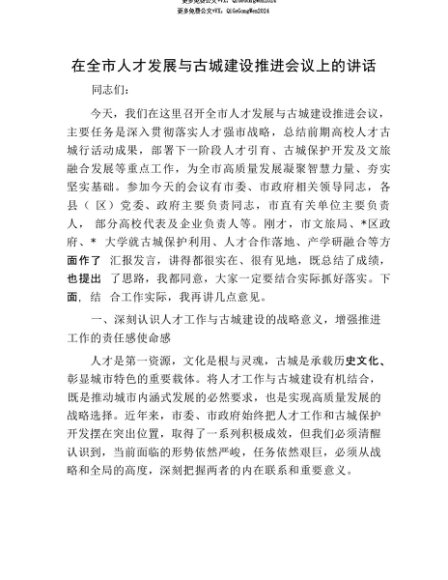 【七哥公文】2025年:【七哥公文】在全市人才发展与古城建设推进会议上的讲话+更多免费公文+VX:QiGeGongWen2024+更多免费公文+VX:QiGeGongWen2024