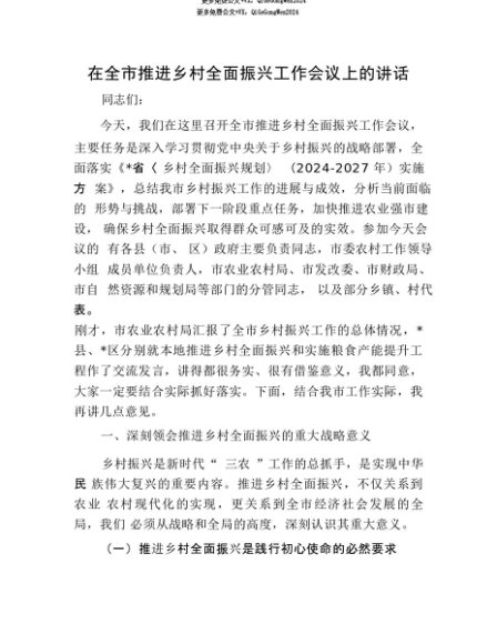 【七哥公文】2025年:【七哥公文】在全市推进乡村全面振兴工作会议上的讲话+更多免费公文+VX:QiGeGongWen2024+更多免费公文+VX:QiGeGongWen2024