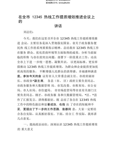 【七哥公文】2025年:【七哥公文】在全市12345热线工作提质增效推进会议上的讲话+更多免费公文+VX:QiGeGongWen2024+更多免费公文+VX:QiGeGongWen2024