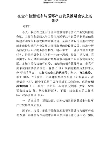 【七哥公文】2025年:【七哥公文】在全市智慧城市与循环产业发展推进会议上的讲话+更多免费公文+VX:QiGeGongWen2024+更多免费公文+VX:QiGeGongWen2024