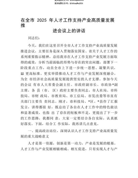 【七哥公文】2025年:【七哥公文】在全市2025年人才工作支持产业高质量发展推进会议上的讲话+更多免费公文+VX:QiGeGongWen2024+更多免费公文+VX:QiGeGongWen2024