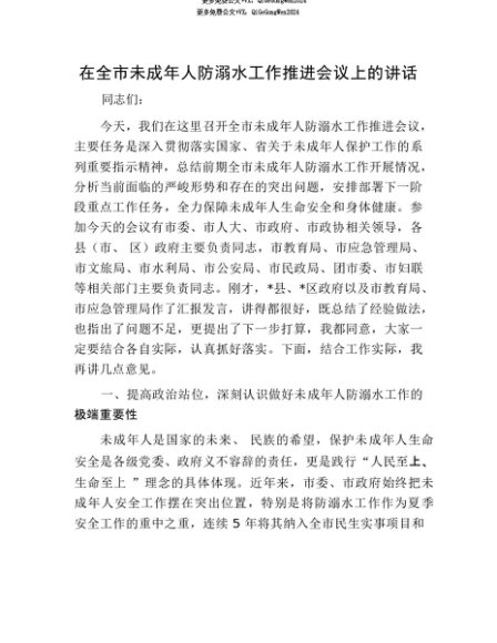 【七哥公文】2025年:【七哥公文】在全市未成年人防溺水工作推进会议上的讲话+更多免费公文+VX:QiGeGongWen2024+更多免费公文+VX:QiGeGongWen2024