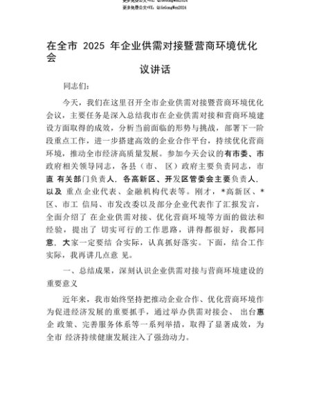 【七哥公文】2025年:【七哥公文】在全市2025年企业供需对接暨营商环境优化会议讲话+更多免费公文+VX:QiGeGongWen2024+更多免费公文+VX:QiGeGongWen2024