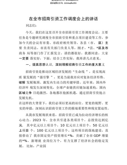 【七哥公文】2025年:【七哥公文】在全市招商引资工作调度会上的讲话+更多免费公文+VX:QiGeGongWen2024+更多免费公文+VX:QiGeGongWen2024