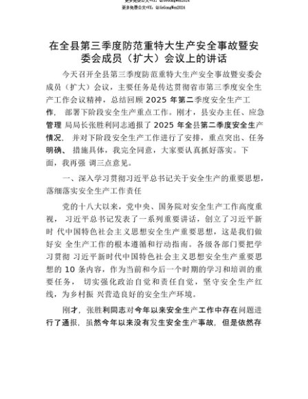 【七哥公文】2025年:【七哥公文】在全县第三季度防范重特大生产安全事故暨安委会成员(扩大)会议上的讲话+更多免费公文+VX:QiGeGongWen2024+更多免费公文+VX:QiGeGongWen2024