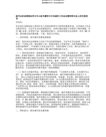 【七哥公文】2025年:【七哥公文】副书记在县委理论学习中心组专题学习中央城市工作会议精神研讨会上的交流发言+更多免费公文+VX:QiGeGongWen2024+更多免费公文+VX:QiGeGongWen2024