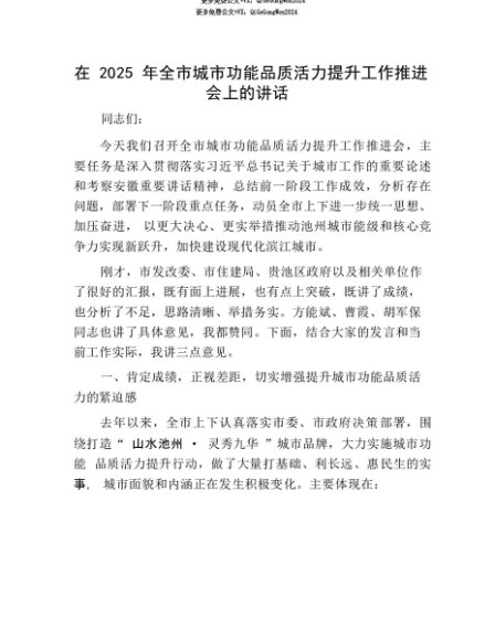 【七哥公文】2025年:【七哥公文】在2025年全市城市功能品质活力提升工作推进会上的讲话+更多免费公文+VX:QiGeGongWen2024+更多免费公文+VX:QiGeGongWen2024