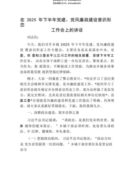 【七哥公文】2025年:【七哥公文】在2025年下半年X建、X风廉政建设意识形态工作会上的讲话+更多免费公文+VX:QiGeGongWen2024+更多免费公文+VX:QiGeGongWen2024