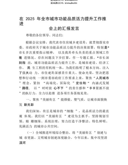 【七哥公文】2025年:【七哥公文】在2025年全市城市功能品质活力提升工作推进会上的汇报发言+更多免费公文+VX:QiGeGongWen2024+更多免费公文+VX:QiGeGongWen2024
