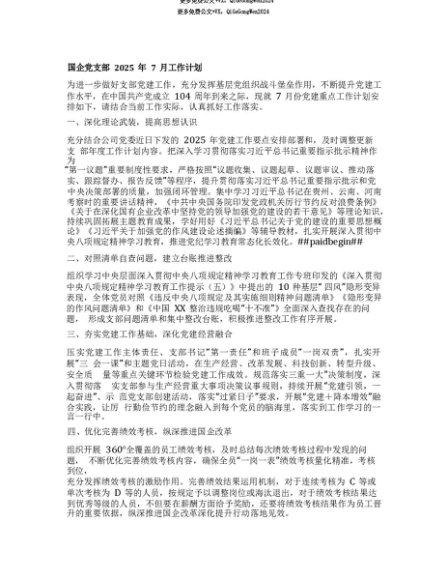 【七哥公文】2025年:【七哥公文】国企X支部2025年7月工作计划+更多免费公文+VX:QiGeGongWen2024+更多免费公文+VX:QiGeGongWen2024