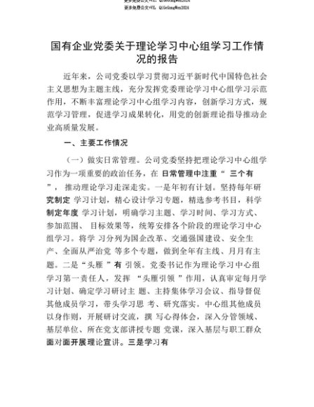 【七哥公文】2025年:【七哥公文】国有企业X委关于理论学习中心组学习工作情况的报告+更多免费公文+VX:QiGeGongWen2024+更多免费公文+VX:QiGeGongWen2024