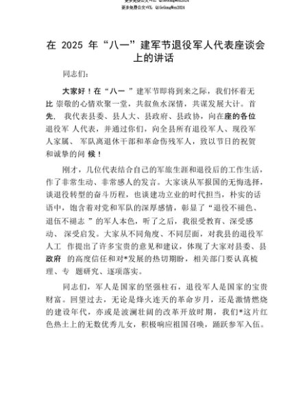 【七哥公文】2025年:【七哥公文】在2025年“八一”建军节退役军人代表座谈会上的讲话+更多免费公文+VX:QiGeGongWen2024+更多免费公文+VX:QiGeGongWen2024