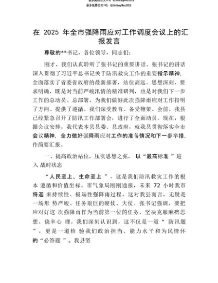【七哥公文】2025年:【七哥公文】在2025年全市强降雨应对工作调度会议上的汇报发言+更多免费公文+VX:QiGeGongWen2024+更多免费公文+VX:QiGeGongWen2024