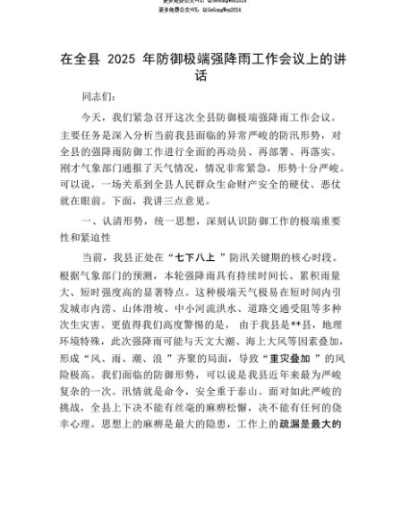 【七哥公文】2025年:【七哥公文】在全县2025年防御极端强降雨工作会议上的讲话+更多免费公文+VX:QiGeGongWen2024+更多免费公文+VX:QiGeGongWen2024