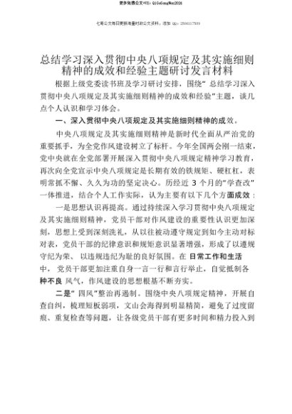 【七哥公文】2025年:【七哥公文】总结学习深入贯彻中央八项规定及其实施细则精神的成效和经验主题研讨发言材料+更多免费公文+VX:QiGeGongWen2024+更多免费公文+VX:QiGeGongWen2024