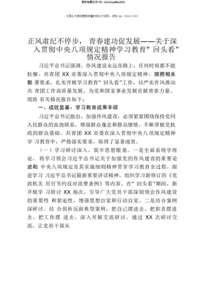 【七哥公文】2025年:【七哥公文】正风肃纪不停步,青春建功促发展——关于深入贯彻中央八项规定精神学习教育“回头看”情况报告+更多免费公文+VX:QiGeGongWen2024+更多免费公文+VX:QiGeGongWen2024