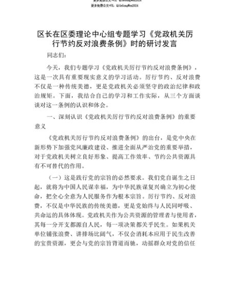 【七哥公文】2025年:【七哥公文】区长在区委理论中心组专题学习《X政机关厉行节约反对浪费条例》时的研讨发言+更多免费公文+VX:QiGeGongWen2024+更多免费公文+VX:QiGeGongWen2024