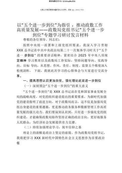 【七哥公文】2025年:【七哥公文】政数局党组书记关于“五个进一步到位”的重要讲话精神学习研讨发言材料(学习第二十一次集体学习时讲话精神)+更多免费公文+VX:QiGeGongWen2024+更多免费公文+VX:QiGeGongWen2024