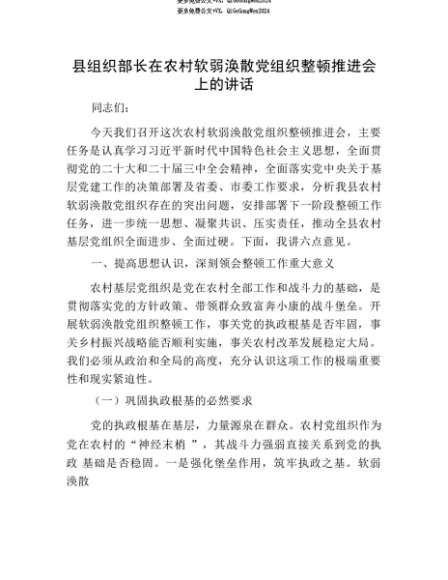 【七哥公文】2025年:【七哥公文】县组织部长在农村软弱涣散X组织整顿推进会上的讲话+更多免费公文+VX:QiGeGongWen2024+更多免费公文+VX:QiGeGongWen2024
