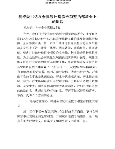 【七哥公文】2025年:【七哥公文】县纪委书记在全县统计造假专项整治部署会上的讲话+更多免费公文+VX:QiGeGongWen2024+更多免费公文+VX:QiGeGongWen2024