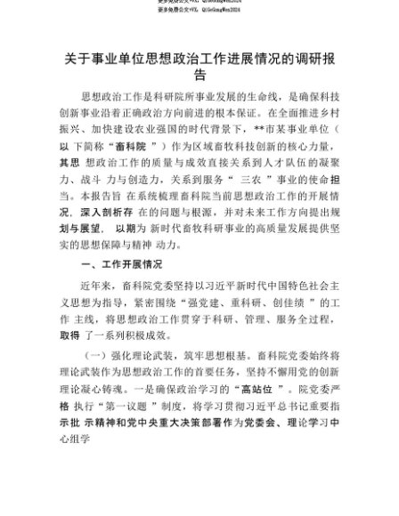 【七哥公文】2025年:【七哥公文】关于事业单位思想ZZ工作进展情况的调研报告+更多免费公文+VX:QiGeGongWen2024+更多免费公文+VX:QiGeGongWen2024