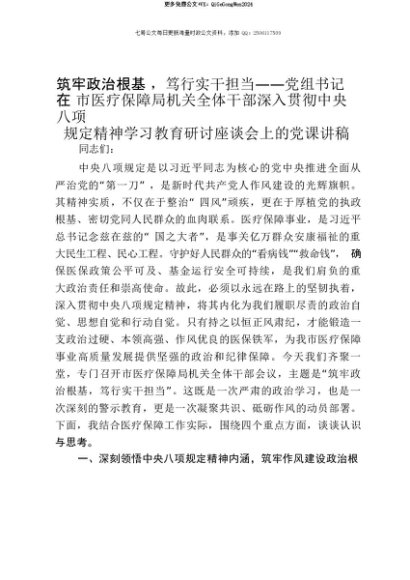 【七哥公文】2025年:【七哥公文】筑牢政治根基,笃行实干担当——党组书记在市医疗保障局机关全体干部深入贯彻中央八项规定精神学习教育研讨座谈会上的党课讲稿+更多免费公文+VX:QiGeGongWen2024+更多免费公文+VX:QiGeGongWen2024