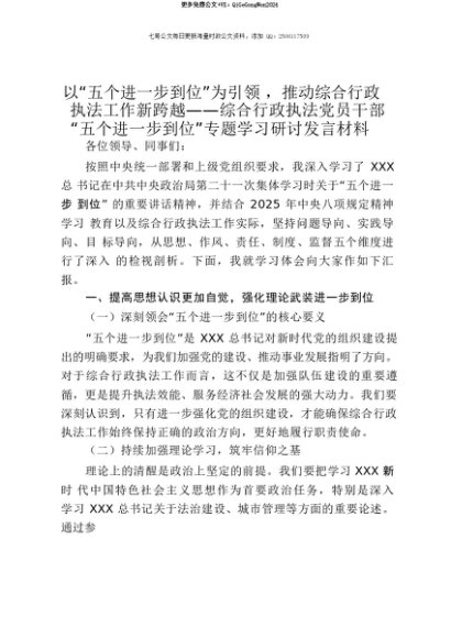 【七哥公文】2025年:【七哥公文】综合行政执法党员干部关于“五个进一步到位”的重要讲话精神学习研讨发言材料(学习第二十一次集体学习时讲话精神)+更多免费公文+VX:QiGeGongWen2024+更多免费公文+VX:QiGeGongWen2024