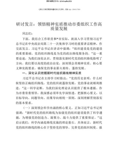 【七哥公文】2025年:【七哥公文】研讨发言:领悟精神实质 推动市委组织工作高质量发展+更多免费公文+VX:QiGeGongWen2024+更多免费公文+VX:QiGeGongWen2024
