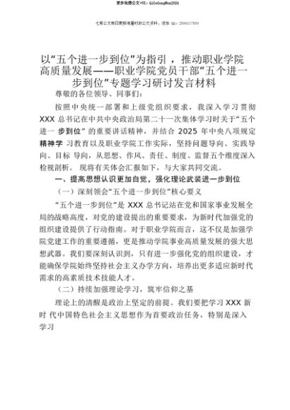 【七哥公文】2025年:【七哥公文】职业学院党员干部关于“五个进一步到位”的重要讲话精神学习研讨发言材料(学习第二十一次集体学习时讲话精神)+更多免费公文+VX:QiGeGongWen2024+更多免费公文+VX:QiGeGongWen2024