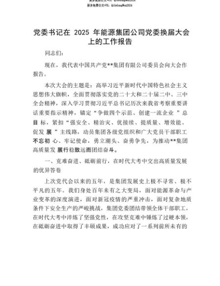 【七哥公文】2025年:【七哥公文】X委书记在2025年能源集团公司X委换届大会上的工作报告+更多免费公文+VX:QiGeGongWen2024+更多免费公文+VX:QiGeGongWen2024