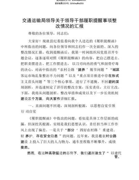 【七哥公文】2025年:【七哥公文】交通运输局领导关于领导干部履职提醒事项整改情况的汇报+更多免费公文+VX:QiGeGongWen2024+更多免费公文+VX:QiGeGongWen2024