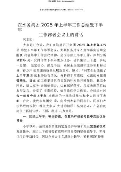 【七哥公文】2025年:【七哥公文】在水务集团2025年上半年工作总结暨下半年工作部署会议上的讲话+更多免费公文+VX:QiGeGongWen2024+更多免费公文+VX:QiGeGongWen2024