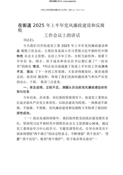 【七哥公文】2025年:【七哥公文】在街道2025年上半年党风廉政建设和反腐败工作会议上的讲话+更多免费公文+VX:QiGeGongWen2024+更多免费公文+VX:QiGeGongWen2024