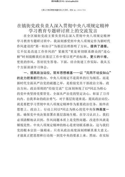 【七哥公文】2025年:【七哥公文】在镇街党政负责人深入贯彻中央八项规定精神学习教育专题研讨班上的交流发言+更多免费公文+VX:QiGeGongWen2024+更多免费公文+VX:QiGeGongWen2024