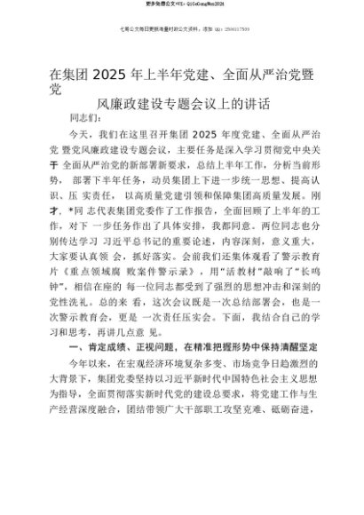 【七哥公文】2025年:【七哥公文】在集团2025年上半年党建、全面从严治党暨党风廉政建设专题会议上的讲话+更多免费公文+VX:QiGeGongWen2024+更多免费公文+VX:QiGeGongWen2024