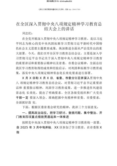【七哥公文】2025年:【七哥公文】在全区深入贯彻中央八项规定精神学习教育总结大会上的讲话+更多免费公文+VX:QiGeGongWen2024+更多免费公文+VX:QiGeGongWen2024