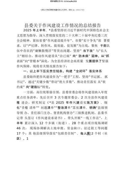 【七哥公文】2025年:【七哥公文】县委关于作风建设工作情况的总结报告+更多免费公文+VX:QiGeGongWen2024+更多免费公文+VX:QiGeGongWen2024