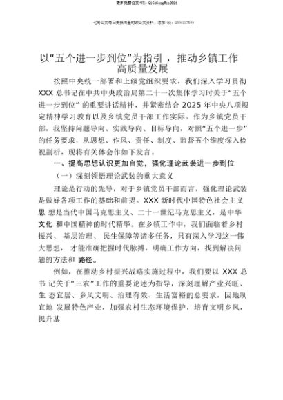 【七哥公文】2025年:【七哥公文】乡镇党员干部关于“五个进一步到位”的重要讲话精神学习研讨发言材料(学习第二十一次集体学习时讲话精神)+更多免费公文+VX:QiGeGongWen2024+更多免费公文+VX:QiGeGongWen2024