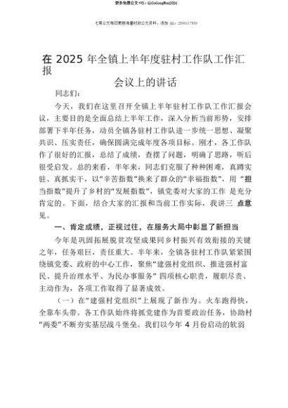 【七哥公文】2025年:【七哥公文】在2025年全镇上半年度驻村工作队工作汇报会议上的讲话+更多免费公文+VX:QiGeGongWen2024+更多免费公文+VX:QiGeGongWen2024