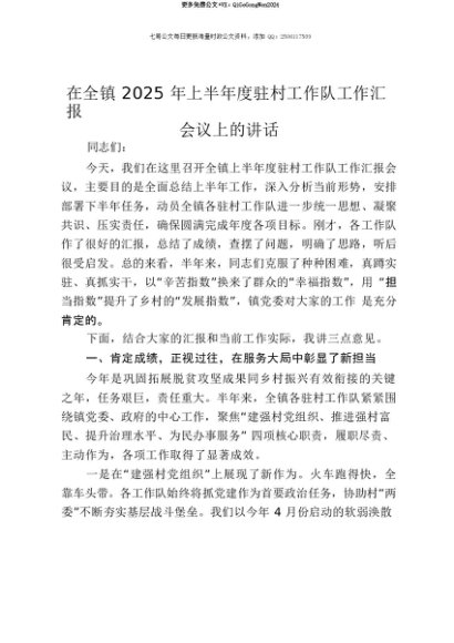 【七哥公文】2025年:【七哥公文】在全镇2025年上半年度驻村工作队工作汇报会议上的讲话+更多免费公文+VX:QiGeGongWen2024+更多免费公文+VX:QiGeGongWen2024