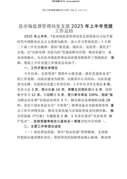 【七哥公文】2025年:【七哥公文】县市场监督管理局党支部2025年上半年党建工作总结+更多免费公文+VX:QiGeGongWen2024+更多免费公文+VX:QiGeGongWen2024