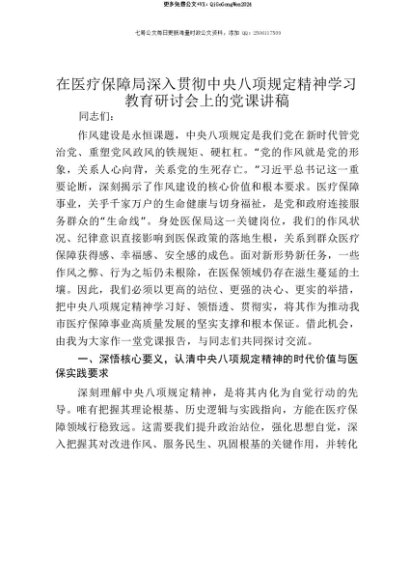 【七哥公文】2025年:【七哥公文】在医疗保障局深入贯彻中央八项规定精神学习教育研讨会上的党课讲稿+更多免费公文+VX:QiGeGongWen2024+更多免费公文+VX:QiGeGongWen2024