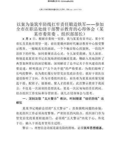 【七哥公文】2025年:【七哥公文】以案为鉴筑牢防线扛牢责任锻造铁军——参加全市在职县处级干部警示教育的心得体会(某某市委常委、组织部部长)+更多免费公文+VX:QiGeGongWen2024+更多免费公文+VX:QiGeGongWen2024