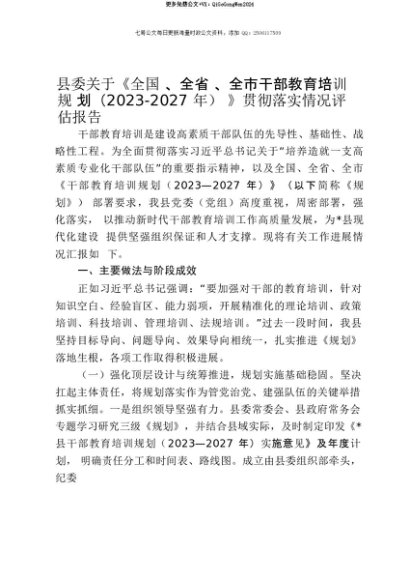 【七哥公文】2025年:【七哥公文】县委关于《全国、全省、全市干部教育培训规划(2023-2027年)》贯彻落实情况评估报告+更多免费公文+VX:QiGeGongWen2024+更多免费公文+VX:QiGeGongWen2024
