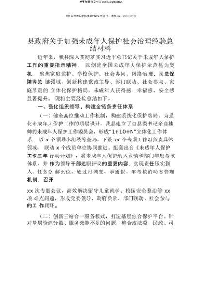【七哥公文】2025年:【七哥公文】县政府关于加强未成年人保护社会治理经验总结材料+更多免费公文+VX:QiGeGongWen2024+更多免费公文+VX:QiGeGongWen2024