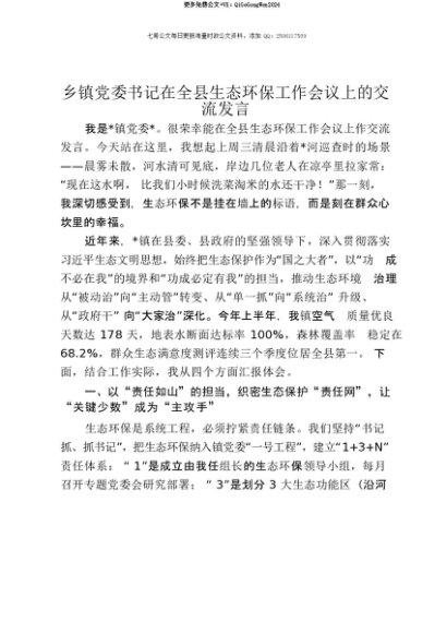 【七哥公文】2025年:【七哥公文】乡镇党委书记在全县生态环保工作会议上的交流发言+更多免费公文+VX:QiGeGongWen2024+更多免费公文+VX:QiGeGongWen2024