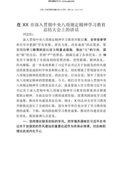 【七哥公文】2025年:【七哥公文】在XX市深入贯彻中央八项规定精神学习教育总结大会上的讲话+更多免费公文+VX:QiGeGongWen2024+更多免费公文+VX:QiGeGongWen2024