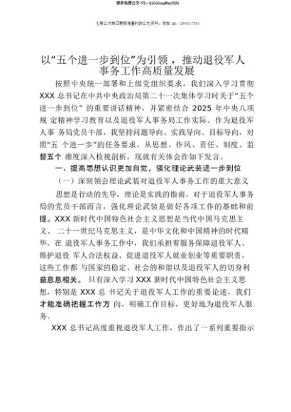 【七哥公文】2025年:【七哥公文】退役军人事务局党员干部关于“五个进一步到位”的重要讲话精神学习研讨发言材料(学习第二十一次集体学习时讲话精神)+更多免费公文+VX:QiGeGongWen2024+更多免费公文+VX:QiGeGongWen2024